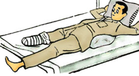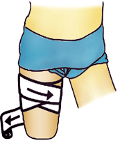 يتــم الربـــط باستـخــدامربـاط ضـاغـط 15 سم و من فوق الركبة بــ 5 سم كما بالشكل و اعادة الربــط كــل 4 سـاعــات |